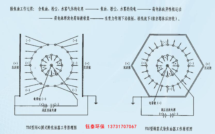 靜電除焦油、油煙、煙塵技術,廣泛應用于化肥、焦化、冶金、建材、碳素、蘭碳、城市煤氣等行業的氣體凈化和液霧的收集。在靜電除焦油器中除去氣體中的焦油、水霧、粉塵后,同時將煤氣、焦爐氣中的焦油收集后于以回收。氣體經凈化后,對保證工藝流程中后序設備一壓縮機、其它工藝設備、閥門、管網等的正常穩定運行,起著至關重要的作用,所以,靜電除焦油器是理想的具有氣體凈化和焦油回收雙重效果的環保設備。